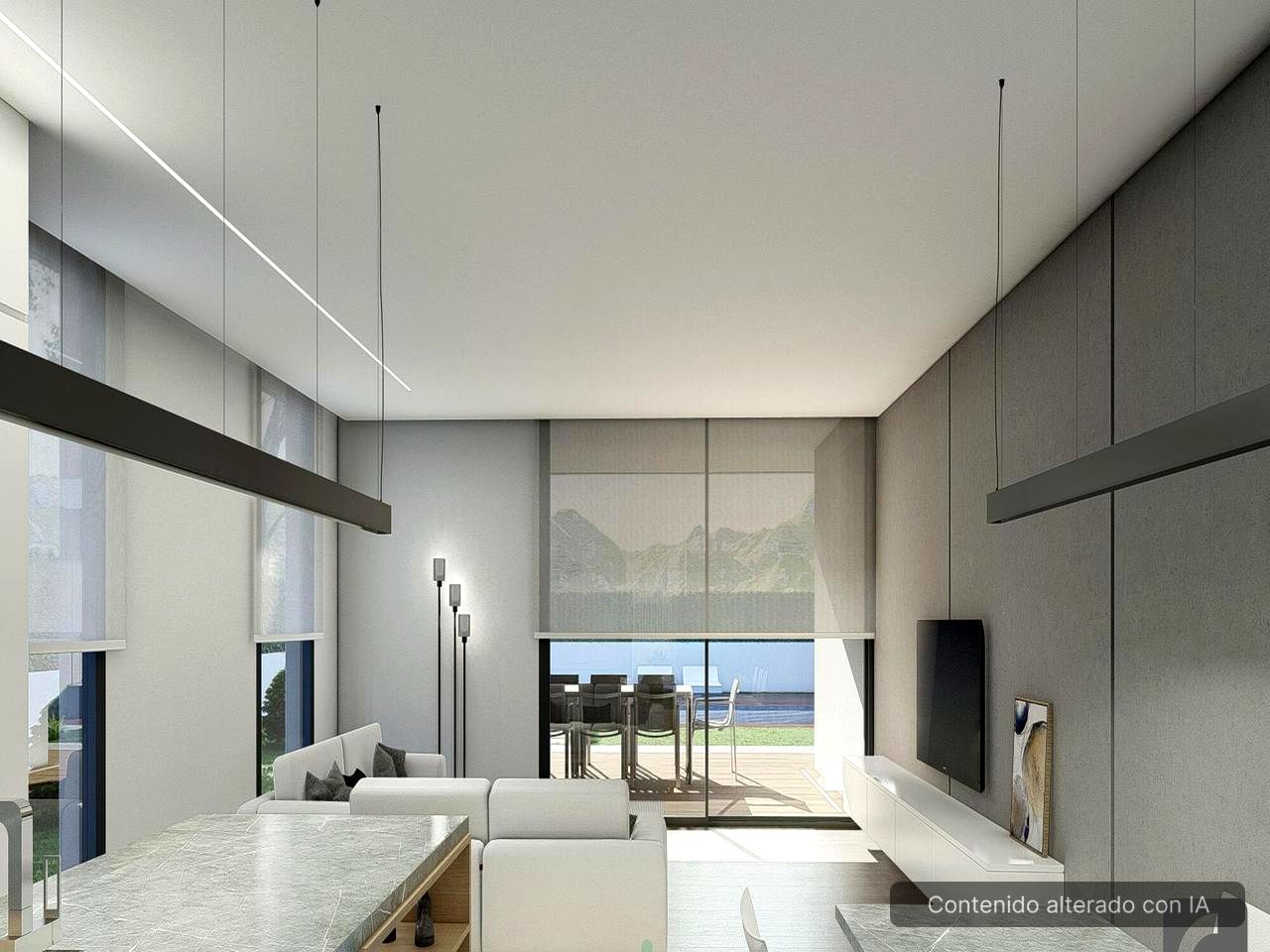 Le salon, la salle à manger et la cuisine s’ouvrent entièrement sur le jardin privé avec piscine, créant un espace idéal pour profiter du climat méditerranéen toute l’année.
